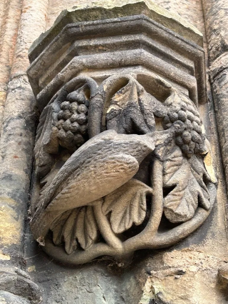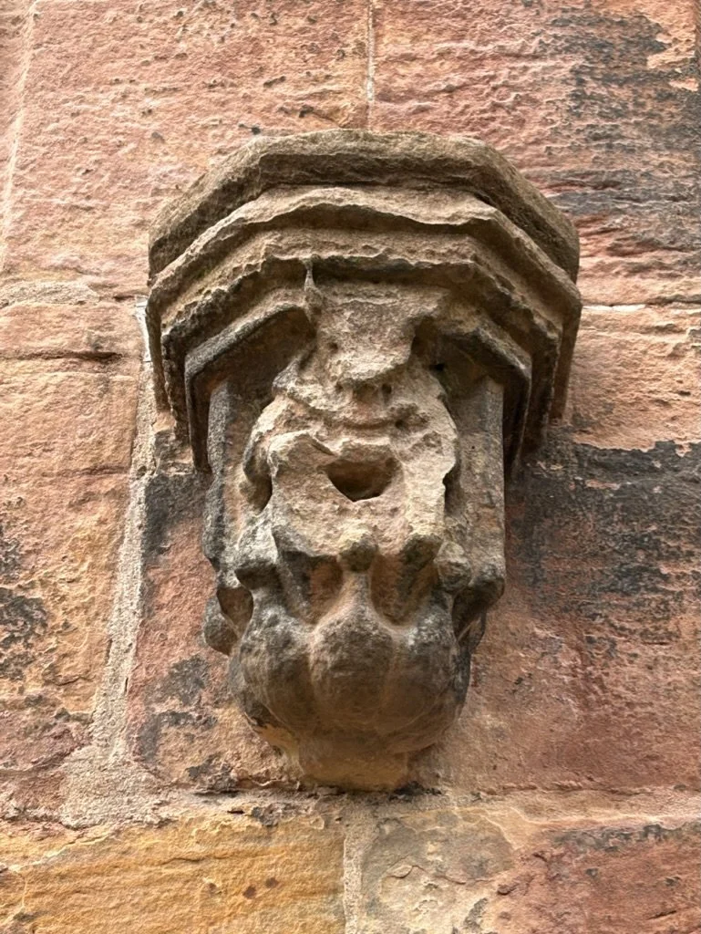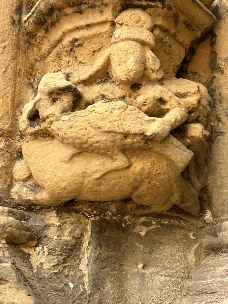 Men entered by the north door. They were exhorted to leave their brutish behaviour outside by grotesque carvings: one with his trousers below his knees, the other with an ape-like face restrained by a stick held behind his flexed knees with flexed elbows.