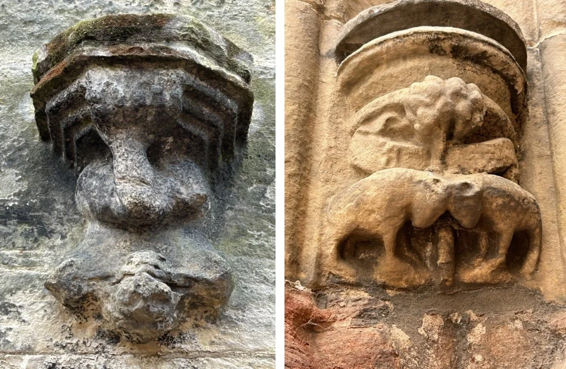 Two grotesques on the north wall exhorting men to reject their base ways before entering the House of God.