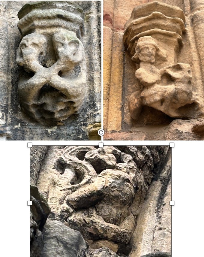 The women entered by the south door. Cromwell’s civil war came to Rosslyn in 1650; the castle was burned down and carvings were smashed. It seems the sculptures depicting women were chosen. These on the south wall probably bore a message to women to cast off their tempting ways and be demure in God’s sight.
