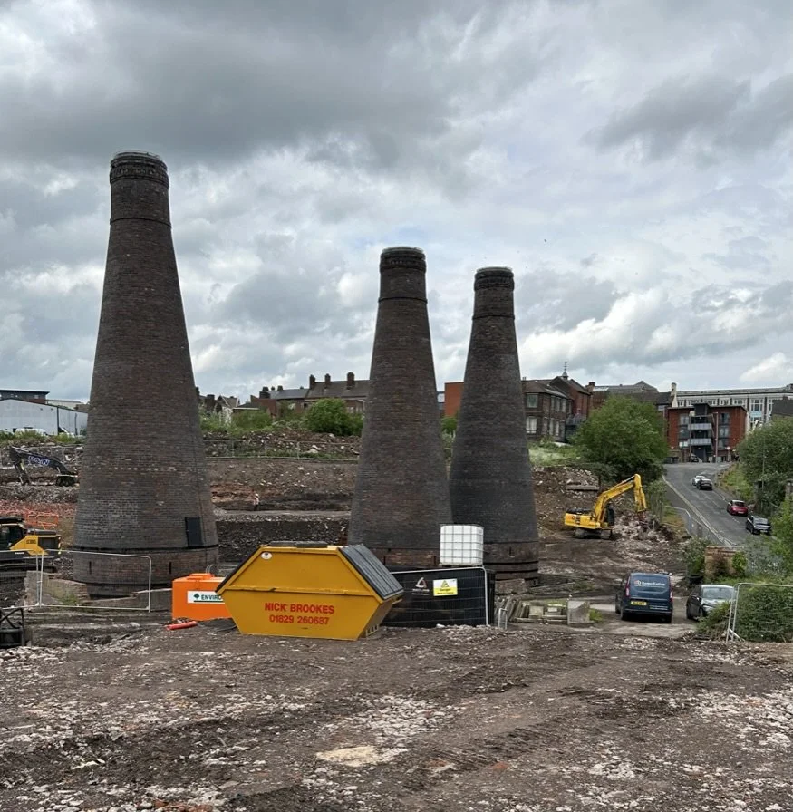 Over the way, Andy explained about the three bottle ovens preserved within a housing development. Their conical shape is different from the bell-shaped bottle oven we saw at Longport. Form following function, these kilns were used for making kiln shelves. The works were operated by the manufacturer of kiln furniture, Acme Marls Ltd between 1937 and 2000.