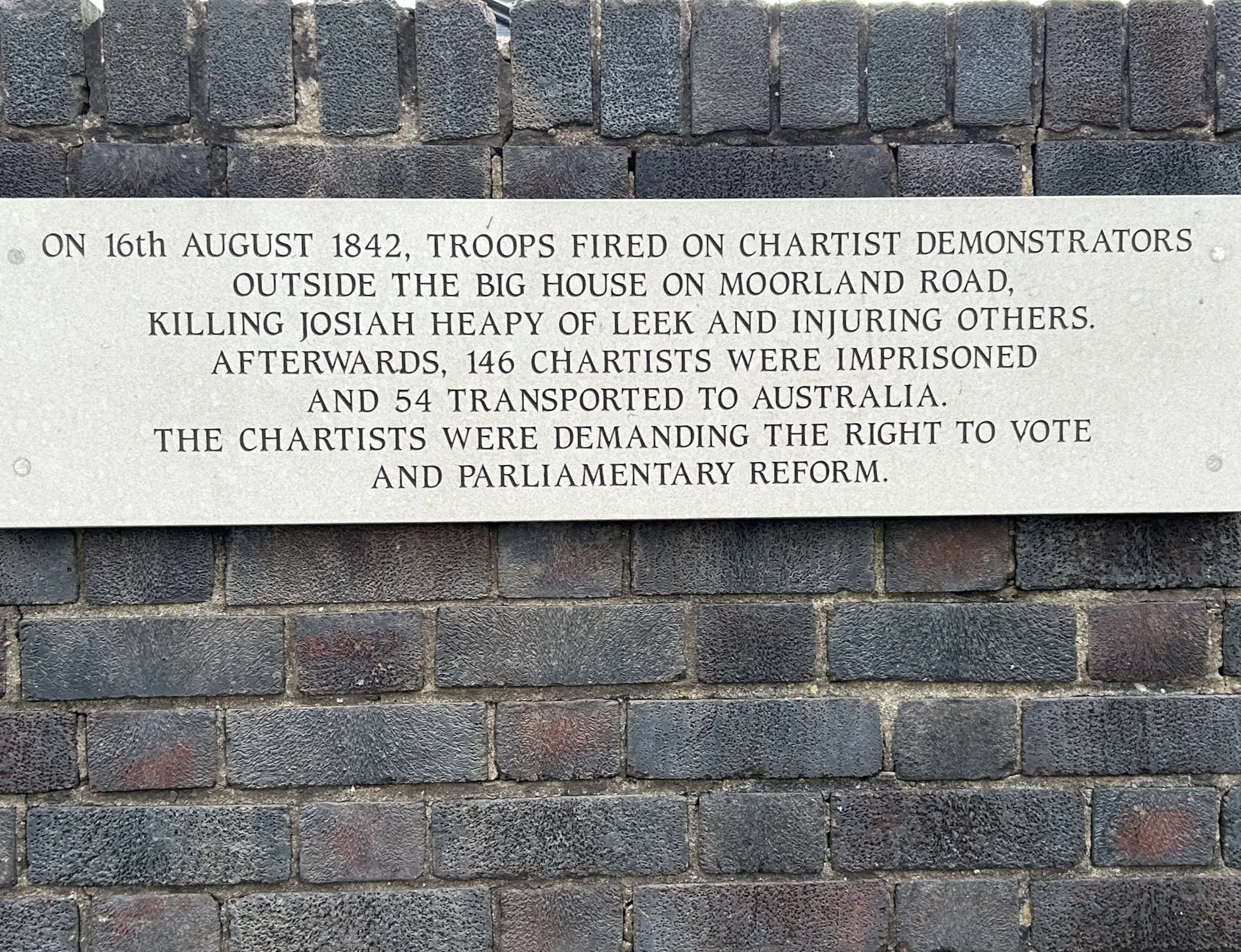 This plaque below the Big House brings my stories of Stoke on Trent full circle. It commemorates the action of a few Dragoons, called up by the magistrates that quelled the Potteries riot in which Henry Howard was caught up and for which he was transported for twenty-one years. But he did not return.