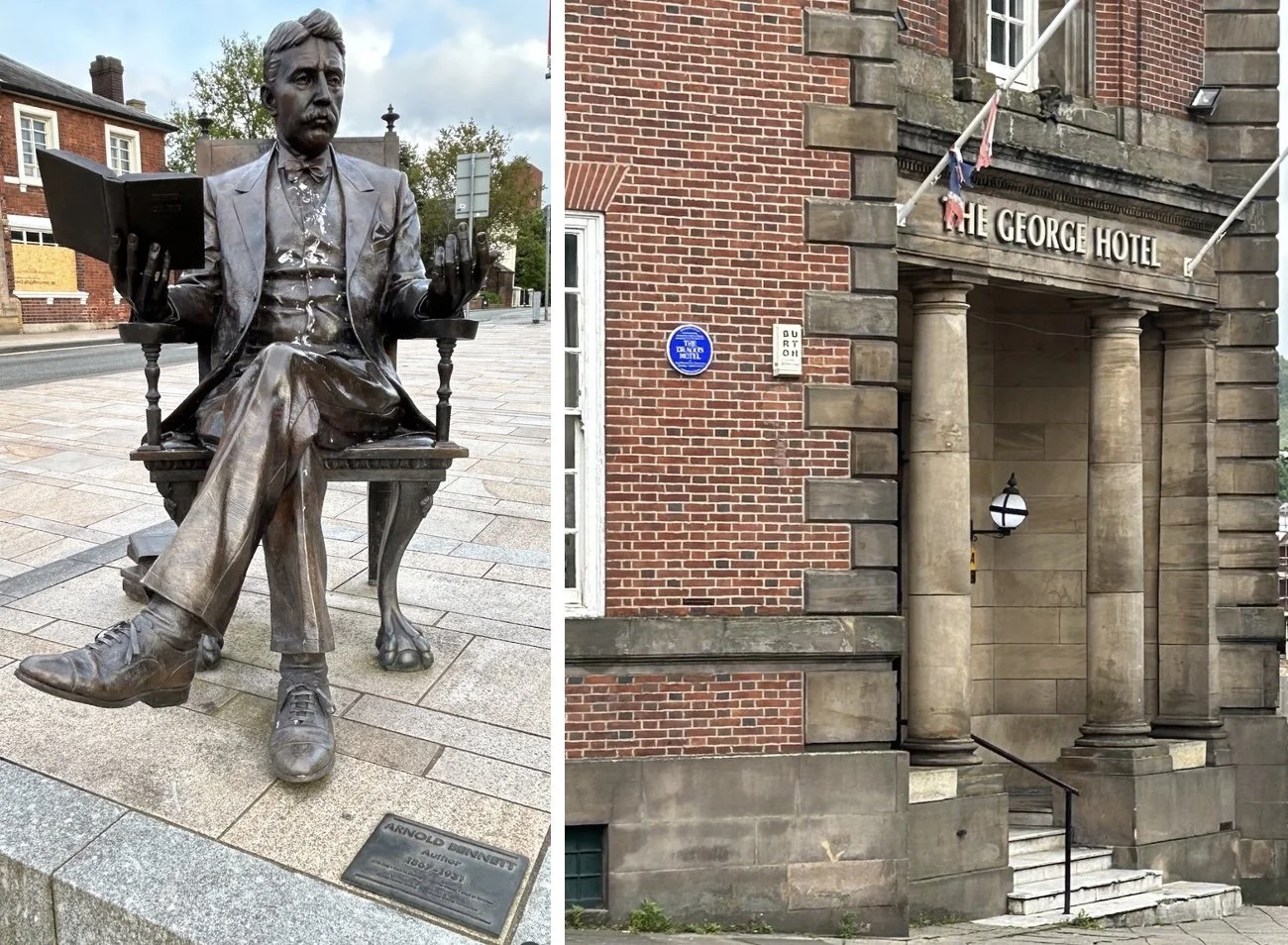 Arnold Bennett was a chronicler of the five towns. The romanticism of his tales is tainted with a grim telling of the lives of the characters who lived in the Potteries. Looking around from Wedgwood Square near the institute, a place once rented by Josiah Wedgwood where the Ivy House teapot factory stood (which was managed by Andy’s great aunt Nell a long time ago), I saw blue plaques which decode Bennett’s thinly disguised names for the buildings which mark his stories. The George Hotel became the Dragon Hotel but I shall have to re-read The Grim Smile of the Five Towns to find out in which story.